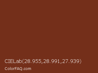 CIELab 28.955,28.991,27.939 Color is a dark red color and the nearest color is Mocha #782d19. Hex code #742f1a and RGB value is rgb(116,47,26). In RGB color space, this color is composed of 45% red, 18% green, 10% blue, In CMYK color space, this color is composed of 0% cyan, 59% magenta, 78% yellow , 55% black , In HSL color space, this color has a hue angle of 14° , 63% saturation and 28% lightness.