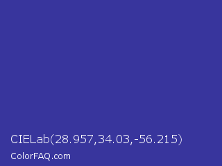 CIELab 28.957,34.03,-56.215 Color is a normal indigo color and the nearest color is Blue Pigment #333399. Hex code #38359d and RGB value is rgb(56,53,157). In RGB color space, this color is composed of 22% red, 21% green, 62% blue, In CMYK color space, this color is composed of 64% cyan, 66% magenta, 0% yellow , 38% black , In HSL color space, this color has a hue angle of 242° , 50% saturation and 41% lightness.