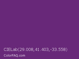 CIELab 29.008,41.403,-33.558 Color is a normal purple color and the nearest color is Midnight #702670. Hex code #682879 and RGB value is rgb(104,40,121). In RGB color space, this color is composed of 41% red, 16% green, 47% blue, In CMYK color space, this color is composed of 14% cyan, 67% magenta, 0% yellow , 53% black , In HSL color space, this color has a hue angle of 287° , 50% saturation and 32% lightness.