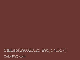 CIELab 29.023,21.891,14.557 Color is a dark red color and the nearest color is Buccaneer #622f30. Hex code #69362f and RGB value is rgb(105,54,47). In RGB color space, this color is composed of 41% red, 21% green, 18% blue, In CMYK color space, this color is composed of 0% cyan, 49% magenta, 55% yellow , 59% black , In HSL color space, this color has a hue angle of 7° , 38% saturation and 30% lightness.