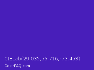 CIELab 29.035,56.716,-73.453 Color is a normal indigo color and the nearest color is Interdimensional Blue #360ccc. Hex code #481eba and RGB value is rgb(72,30,186). In RGB color space, this color is composed of 28% red, 12% green, 73% blue, In CMYK color space, this color is composed of 61% cyan, 84% magenta, 0% yellow , 27% black , In HSL color space, this color has a hue angle of 256° , 72% saturation and 42% lightness.