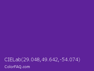 CIELab 29.048,49.642,-54.074 Color is a normal violet color and the nearest color is Daisy Bush #4f2398. Hex code #5e229a and RGB value is rgb(94,34,154). In RGB color space, this color is composed of 37% red, 13% green, 60% blue, In CMYK color space, this color is composed of 39% cyan, 78% magenta, 0% yellow , 40% black , In HSL color space, this color has a hue angle of 270° , 64% saturation and 37% lightness.