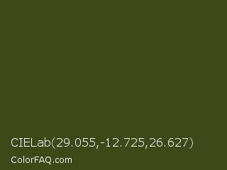 CIELab 29.055,-12.725,26.627 Color is a very dark lime color and the nearest color is Clover #384910. Hex code #3e4919 and RGB value is rgb(62,73,25). In RGB color space, this color is composed of 24% red, 29% green, 10% blue, In CMYK color space, this color is composed of 15% cyan, 0% magenta, 66% yellow , 71% black , In HSL color space, this color has a hue angle of 74° , 49% saturation and 19% lightness.