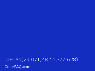 CIELab 29.071,48.15,-77.628 Color is a normal blue color and the nearest color is Persian Blue #1c39bb. Hex code #132dc1 and RGB value is rgb(19,45,193). In RGB color space, this color is composed of 7% red, 18% green, 76% blue, In CMYK color space, this color is composed of 90% cyan, 77% magenta, 0% yellow , 24% black , In HSL color space, this color has a hue angle of 231° , 82% saturation and 42% lightness.