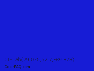 CIELab 29.076,62.7,-89.878 Color is a normal blue color and the nearest color is Bluebonnet #1c1cf0. Hex code #171cd6 and RGB value is rgb(23,28,214). In RGB color space, this color is composed of 9% red, 11% green, 84% blue, In CMYK color space, this color is composed of 89% cyan, 87% magenta, 0% yellow , 16% black , In HSL color space, this color has a hue angle of 238° , 81% saturation and 46% lightness.