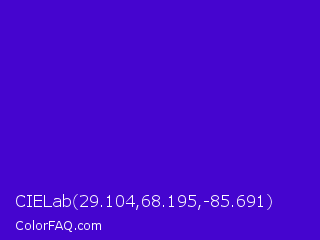 CIELab 29.104,68.195,-85.691 Color is a normal indigo color and the nearest color is Interdimensional Blue #360ccc. Hex code #4505cf and RGB value is rgb(69,5,207). In RGB color space, this color is composed of 27% red, 2% green, 81% blue, In CMYK color space, this color is composed of 67% cyan, 98% magenta, 0% yellow , 19% black , In HSL color space, this color has a hue angle of 259° , 95% saturation and 42% lightness.