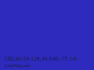 CIELab 29.128,49.848,-75.14 Color is a normal indigo color and the nearest color is Governor Bay #2f3cb3. Hex code #2d2abd and RGB value is rgb(45,42,189). In RGB color space, this color is composed of 18% red, 16% green, 74% blue, In CMYK color space, this color is composed of 76% cyan, 78% magenta, 0% yellow , 26% black , In HSL color space, this color has a hue angle of 241° , 64% saturation and 45% lightness.