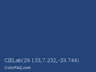 CIELab 29.133,7.232,-33.744 Color is a normal blue color and the nearest color is Astronaut #283a77. Hex code #244479 and RGB value is rgb(36,68,121). In RGB color space, this color is composed of 14% red, 27% green, 47% blue, In CMYK color space, this color is composed of 70% cyan, 44% magenta, 0% yellow , 53% black , In HSL color space, this color has a hue angle of 217° , 54% saturation and 31% lightness.