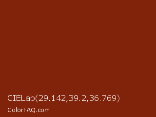 CIELab 29.142,39.2,36.769 Color is a dark red color and the nearest color is Smokey Topaz #832a0d. Hex code #81230b and RGB value is rgb(129,35,11). In RGB color space, this color is composed of 51% red, 14% green, 4% blue, In CMYK color space, this color is composed of 0% cyan, 73% magenta, 91% yellow , 49% black , In HSL color space, this color has a hue angle of 12° , 84% saturation and 27% lightness.