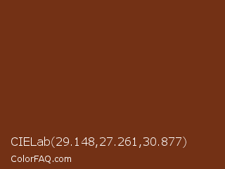 CIELab 29.148,27.261,30.877 Color is a dark orange color and the nearest color is Peanut #782f16. Hex code #733115 and RGB value is rgb(115,49,21). In RGB color space, this color is composed of 45% red, 19% green, 8% blue, In CMYK color space, this color is composed of 0% cyan, 57% magenta, 82% yellow , 55% black , In HSL color space, this color has a hue angle of 18° , 69% saturation and 27% lightness.