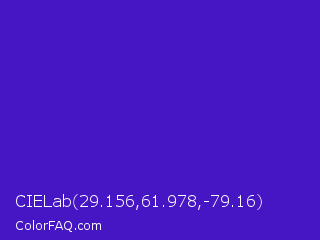 CIELab 29.156,61.978,-79.16 Color is a normal indigo color and the nearest color is Interdimensional Blue #360ccc. Hex code #4716c4 and RGB value is rgb(71,22,196). In RGB color space, this color is composed of 28% red, 9% green, 77% blue, In CMYK color space, this color is composed of 64% cyan, 89% magenta, 0% yellow , 23% black , In HSL color space, this color has a hue angle of 257° , 80% saturation and 43% lightness.