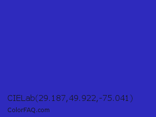 CIELab 29.187,49.922,-75.041 Color is a normal indigo color and the nearest color is Governor Bay #2f3cb3. Hex code #2e2abd and RGB value is rgb(46,42,189). In RGB color space, this color is composed of 18% red, 16% green, 74% blue, In CMYK color space, this color is composed of 76% cyan, 78% magenta, 0% yellow , 26% black , In HSL color space, this color has a hue angle of 242° , 64% saturation and 45% lightness.
