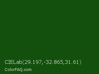 CIELab 29.197,-32.865,31.61 Color is a very dark green color and the nearest color is Parsley #134f19. Hex code #14500d and RGB value is rgb(20,80,13). In RGB color space, this color is composed of 8% red, 31% green, 5% blue, In CMYK color space, this color is composed of 75% cyan, 0% magenta, 84% yellow , 69% black , In HSL color space, this color has a hue angle of 114° , 72% saturation and 18% lightness.
