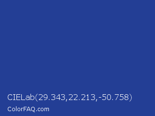 CIELab 29.343,22.213,-50.758 Color is a normal blue color and the nearest color is Blue Pigment #333399. Hex code #233e95 and RGB value is rgb(35,62,149). In RGB color space, this color is composed of 14% red, 24% green, 58% blue, In CMYK color space, this color is composed of 77% cyan, 58% magenta, 0% yellow , 42% black , In HSL color space, this color has a hue angle of 226° , 62% saturation and 36% lightness.
