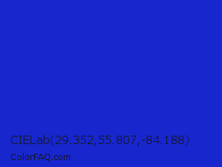 CIELab 29.352,55.807,-84.188 Color is a normal blue color and the nearest color is Persian Blue #1c39bb. Hex code #1726cd and RGB value is rgb(23,38,205). In RGB color space, this color is composed of 9% red, 15% green, 80% blue, In CMYK color space, this color is composed of 89% cyan, 81% magenta, 0% yellow , 20% black , In HSL color space, this color has a hue angle of 235° , 80% saturation and 45% lightness.