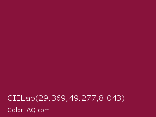 CIELab 29.369,49.277,8.043 Color is a dark rose color and the nearest color is Claret #7f1734. Hex code #88123b and RGB value is rgb(136,18,59). In RGB color space, this color is composed of 53% red, 7% green, 23% blue, In CMYK color space, this color is composed of 0% cyan, 87% magenta, 57% yellow , 47% black , In HSL color space, this color has a hue angle of 339° , 77% saturation and 30% lightness.