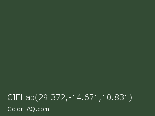 CIELab 29.372,-14.671,10.831 Color is a dark green color and the nearest color is Kombu Green #354230. Hex code #334b34 and RGB value is rgb(51,75,52). In RGB color space, this color is composed of 20% red, 29% green, 20% blue, In CMYK color space, this color is composed of 32% cyan, 0% magenta, 31% yellow , 71% black , In HSL color space, this color has a hue angle of 123° , 19% saturation and 25% lightness.