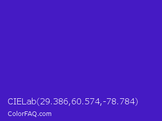CIELab 29.386,60.574,-78.784 Color is a normal indigo color and the nearest color is Interdimensional Blue #360ccc. Hex code #451ac4 and RGB value is rgb(69,26,196). In RGB color space, this color is composed of 27% red, 10% green, 77% blue, In CMYK color space, this color is composed of 65% cyan, 87% magenta, 0% yellow , 23% black , In HSL color space, this color has a hue angle of 255° , 77% saturation and 44% lightness.