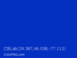 CIELab 29.387,46.038,-77.112 Color is a normal blue color and the nearest color is UA Blue #0033aa. Hex code #0430c1 and RGB value is rgb(4,48,193). In RGB color space, this color is composed of 2% red, 19% green, 76% blue, In CMYK color space, this color is composed of 98% cyan, 75% magenta, 0% yellow , 24% black , In HSL color space, this color has a hue angle of 226° , 96% saturation and 39% lightness.