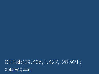 CIELab 29.406,1.427,-28.921 Color is a dark blue color and the nearest color is Chathams Blue #175579. Hex code #1e4772 and RGB value is rgb(30,71,114). In RGB color space, this color is composed of 12% red, 28% green, 45% blue, In CMYK color space, this color is composed of 74% cyan, 38% magenta, 0% yellow , 55% black , In HSL color space, this color has a hue angle of 211° , 58% saturation and 28% lightness.