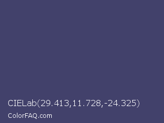 CIELab 29.413,11.728,-24.325 Color is a normal indigo color and the nearest color is Mulled Wine #4e4562. Hex code #42416b and RGB value is rgb(66,65,107). In RGB color space, this color is composed of 26% red, 25% green, 42% blue, In CMYK color space, this color is composed of 38% cyan, 39% magenta, 0% yellow , 58% black , In HSL color space, this color has a hue angle of 241° , 24% saturation and 34% lightness.