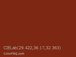 CIELab 29.422,36.17,32.363 Color is a dark red color and the nearest color is Pueblo #7d2c14. Hex code #7e2814 and RGB value is rgb(126,40,20). In RGB color space, this color is composed of 49% red, 16% green, 8% blue, In CMYK color space, this color is composed of 0% cyan, 68% magenta, 84% yellow , 51% black , In HSL color space, this color has a hue angle of 11° , 73% saturation and 29% lightness.