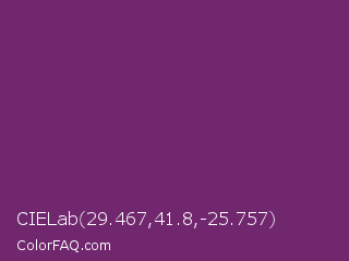 CIELab 29.467,41.8,-25.757 Color is a dark magenta color and the nearest color is Midnight #702670. Hex code #70276e and RGB value is rgb(112,39,110). In RGB color space, this color is composed of 44% red, 15% green, 43% blue, In CMYK color space, this color is composed of 0% cyan, 65% magenta, 2% yellow , 56% black , In HSL color space, this color has a hue angle of 302° , 48% saturation and 30% lightness.