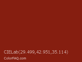 CIELab 29.499,42.951,35.114 Color is a dark red color and the nearest color is Falu Red #801818. Hex code #861e10 and RGB value is rgb(134,30,16). In RGB color space, this color is composed of 53% red, 12% green, 6% blue, In CMYK color space, this color is composed of 0% cyan, 78% magenta, 88% yellow , 47% black , In HSL color space, this color has a hue angle of 7° , 79% saturation and 29% lightness.