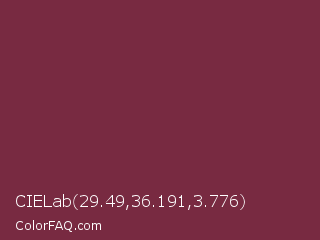 CIELab 29.49,36.191,3.776 Color is a normal rose color and the nearest color is Wine #722f37. Hex code #782a41 and RGB value is rgb(120,42,65). In RGB color space, this color is composed of 47% red, 16% green, 25% blue, In CMYK color space, this color is composed of 0% cyan, 65% magenta, 46% yellow , 53% black , In HSL color space, this color has a hue angle of 342° , 48% saturation and 32% lightness.