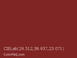 CIELab 29.512,38.937,23.071 Color is a normal red color and the nearest color is Crown Of Thorns #771f1f. Hex code #802524 and RGB value is rgb(128,37,36). In RGB color space, this color is composed of 50% red, 15% green, 14% blue, In CMYK color space, this color is composed of 0% cyan, 71% magenta, 72% yellow , 50% black , In HSL color space, this color has a hue angle of 1° , 56% saturation and 32% lightness.
