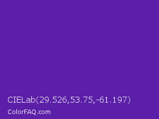 CIELab 29.526,53.75,-61.197 Color is a normal violet color and the nearest color is Daisy Bush #4f2398. Hex code #5c1fa7 and RGB value is rgb(92,31,167). In RGB color space, this color is composed of 36% red, 12% green, 65% blue, In CMYK color space, this color is composed of 45% cyan, 81% magenta, 0% yellow , 35% black , In HSL color space, this color has a hue angle of 267° , 69% saturation and 39% lightness.