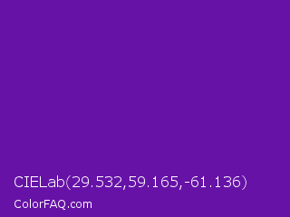 CIELab 29.532,59.165,-61.136 Color is a normal purple color and the nearest color is Purple #660099. Hex code #6612a7 and RGB value is rgb(102,18,167). In RGB color space, this color is composed of 40% red, 7% green, 65% blue, In CMYK color space, this color is composed of 39% cyan, 89% magenta, 0% yellow , 35% black , In HSL color space, this color has a hue angle of 274° , 81% saturation and 36% lightness.