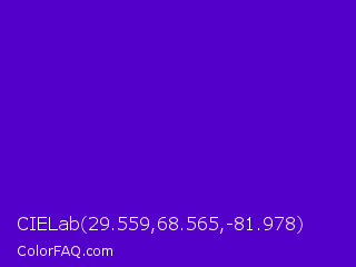 CIELab 29.559,68.565,-81.978 Color is a normal violet color and the nearest color is Interdimensional Blue #360ccc. Hex code #5200ca and RGB value is rgb(82,0,202). In RGB color space, this color is composed of 32% red, 0% green, 79% blue, In CMYK color space, this color is composed of 59% cyan, 100% magenta, 0% yellow , 21% black , In HSL color space, this color has a hue angle of 264° , 100% saturation and 40% lightness.
