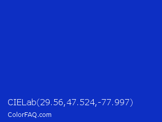 CIELab 29.56,47.524,-77.997 Color is a normal blue color and the nearest color is Persian Blue #1c39bb. Hex code #0d2fc3 and RGB value is rgb(13,47,195). In RGB color space, this color is composed of 5% red, 18% green, 76% blue, In CMYK color space, this color is composed of 93% cyan, 76% magenta, 0% yellow , 24% black , In HSL color space, this color has a hue angle of 229° , 88% saturation and 41% lightness.