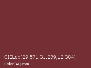 CIELab 29.571,31.239,12.384 Color is a normal red color and the nearest color is Wine #722f37. Hex code #752f34 and RGB value is rgb(117,47,52). In RGB color space, this color is composed of 46% red, 18% green, 20% blue, In CMYK color space, this color is composed of 0% cyan, 60% magenta, 56% yellow , 54% black , In HSL color space, this color has a hue angle of 356° , 43% saturation and 32% lightness.