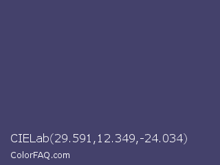 CIELab 29.591,12.349,-24.034 Color is a normal indigo color and the nearest color is Mulled Wine #4e4562. Hex code #44416b and RGB value is rgb(68,65,107). In RGB color space, this color is composed of 27% red, 25% green, 42% blue, In CMYK color space, this color is composed of 36% cyan, 39% magenta, 0% yellow , 58% black , In HSL color space, this color has a hue angle of 244° , 24% saturation and 34% lightness.