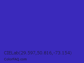 CIELab 29.597,50.816,-73.154 Color is a normal indigo color and the nearest color is Governor Bay #2f3cb3. Hex code #3a29bb and RGB value is rgb(58,41,187). In RGB color space, this color is composed of 23% red, 16% green, 73% blue, In CMYK color space, this color is composed of 69% cyan, 78% magenta, 0% yellow , 27% black , In HSL color space, this color has a hue angle of 247° , 64% saturation and 45% lightness.