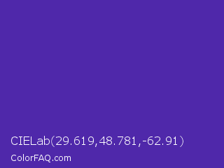 CIELab 29.619,48.781,-62.91 Color is a normal indigo color and the nearest color is Daisy Bush #4f2398. Hex code #4f28aa and RGB value is rgb(79,40,170). In RGB color space, this color is composed of 31% red, 16% green, 67% blue, In CMYK color space, this color is composed of 54% cyan, 76% magenta, 0% yellow , 33% black , In HSL color space, this color has a hue angle of 258° , 62% saturation and 41% lightness.