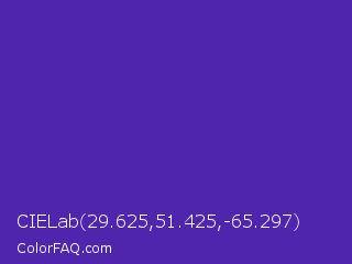 CIELab 29.625,51.425,-65.297 Color is a normal indigo color and the nearest color is Daisy Bush #4f2398. Hex code #5025ae and RGB value is rgb(80,37,174). In RGB color space, this color is composed of 31% red, 15% green, 68% blue, In CMYK color space, this color is composed of 54% cyan, 79% magenta, 0% yellow , 32% black , In HSL color space, this color has a hue angle of 259° , 65% saturation and 41% lightness.