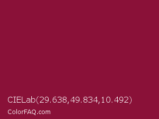 CIELab 29.638,49.834,10.492 Color is a dark rose color and the nearest color is Claret #7f1734. Hex code #8a1138 and RGB value is rgb(138,17,56). In RGB color space, this color is composed of 54% red, 7% green, 22% blue, In CMYK color space, this color is composed of 0% cyan, 88% magenta, 59% yellow , 46% black , In HSL color space, this color has a hue angle of 341° , 78% saturation and 30% lightness.