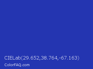 CIELab 29.652,38.764,-67.163 Color is a normal blue color and the nearest color is Governor Bay #2f3cb3. Hex code #2435b1 and RGB value is rgb(36,53,177). In RGB color space, this color is composed of 14% red, 21% green, 69% blue, In CMYK color space, this color is composed of 80% cyan, 70% magenta, 0% yellow , 31% black , In HSL color space, this color has a hue angle of 233° , 66% saturation and 42% lightness.