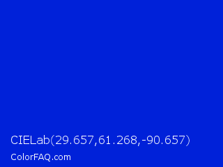 CIELab 29.657,61.268,-90.657 Color is a normal blue color and the nearest color is Medium Blue #0000cd. Hex code #0021d9 and RGB value is rgb(0,33,217). In RGB color space, this color is composed of 0% red, 13% green, 85% blue, In CMYK color space, this color is composed of 100% cyan, 85% magenta, 0% yellow , 15% black , In HSL color space, this color has a hue angle of 231° , 100% saturation and 43% lightness.