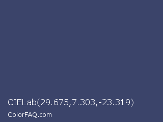 CIELab 29.675,7.303,-23.319 Color is a normal blue color and the nearest color is San Juan #304b6a. Hex code #3b446a and RGB value is rgb(59,68,106). In RGB color space, this color is composed of 23% red, 27% green, 42% blue, In CMYK color space, this color is composed of 44% cyan, 36% magenta, 0% yellow , 58% black , In HSL color space, this color has a hue angle of 229° , 28% saturation and 32% lightness.