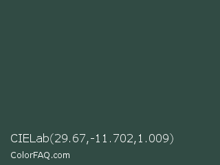 CIELab 29.67,-11.702,1.009 Color is a dark cyan color and the nearest color is Dark Slate Gray #2f4f4f. Hex code #314b44 and RGB value is rgb(49,75,68). In RGB color space, this color is composed of 19% red, 29% green, 27% blue, In CMYK color space, this color is composed of 35% cyan, 0% magenta, 9% yellow , 71% black , In HSL color space, this color has a hue angle of 164° , 21% saturation and 24% lightness.