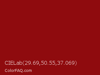 CIELab 29.69,50.55,37.069 Color is a dark red color and the nearest color is Sangria #92000a. Hex code #8f0b0e and RGB value is rgb(143,11,14). In RGB color space, this color is composed of 56% red, 4% green, 5% blue, In CMYK color space, this color is composed of 0% cyan, 92% magenta, 90% yellow , 44% black , In HSL color space, this color has a hue angle of 359° , 86% saturation and 30% lightness.