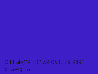CIELab 29.732,59.068,-79.989 Color is a normal indigo color and the nearest color is Interdimensional Blue #360ccc. Hex code #3e1fc7 and RGB value is rgb(62,31,199). In RGB color space, this color is composed of 24% red, 12% green, 78% blue, In CMYK color space, this color is composed of 69% cyan, 84% magenta, 0% yellow , 22% black , In HSL color space, this color has a hue angle of 251° , 73% saturation and 45% lightness.