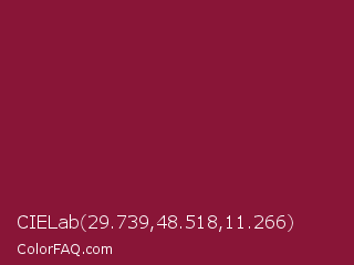 CIELab 29.739,48.518,11.266 Color is a normal rose color and the nearest color is Claret #7f1734. Hex code #891537 and RGB value is rgb(137,21,55). In RGB color space, this color is composed of 54% red, 8% green, 22% blue, In CMYK color space, this color is composed of 0% cyan, 85% magenta, 60% yellow , 46% black , In HSL color space, this color has a hue angle of 342° , 73% saturation and 31% lightness.
