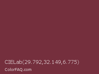 CIELab 29.792,32.149,6.775 Color is a normal red color and the nearest color is Wine #722f37. Hex code #752f3d and RGB value is rgb(117,47,61). In RGB color space, this color is composed of 46% red, 18% green, 24% blue, In CMYK color space, this color is composed of 0% cyan, 60% magenta, 48% yellow , 54% black , In HSL color space, this color has a hue angle of 348° , 43% saturation and 32% lightness.