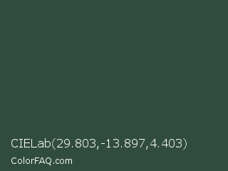 CIELab 29.803,-13.897,4.403 Color is a dark green color and the nearest color is Lunar Green #3c493a. Hex code #304c3f and RGB value is rgb(48,76,63). In RGB color space, this color is composed of 19% red, 30% green, 25% blue, In CMYK color space, this color is composed of 37% cyan, 0% magenta, 17% yellow , 70% black , In HSL color space, this color has a hue angle of 152° , 23% saturation and 24% lightness.