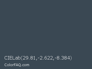 CIELab 29.81,-2.622,-8.384 Color is a dark blue color and the nearest color is Limed Spruce #394851. Hex code #3a4853 and RGB value is rgb(58,72,83). In RGB color space, this color is composed of 23% red, 28% green, 33% blue, In CMYK color space, this color is composed of 30% cyan, 13% magenta, 0% yellow , 67% black , In HSL color space, this color has a hue angle of 206° , 18% saturation and 28% lightness.